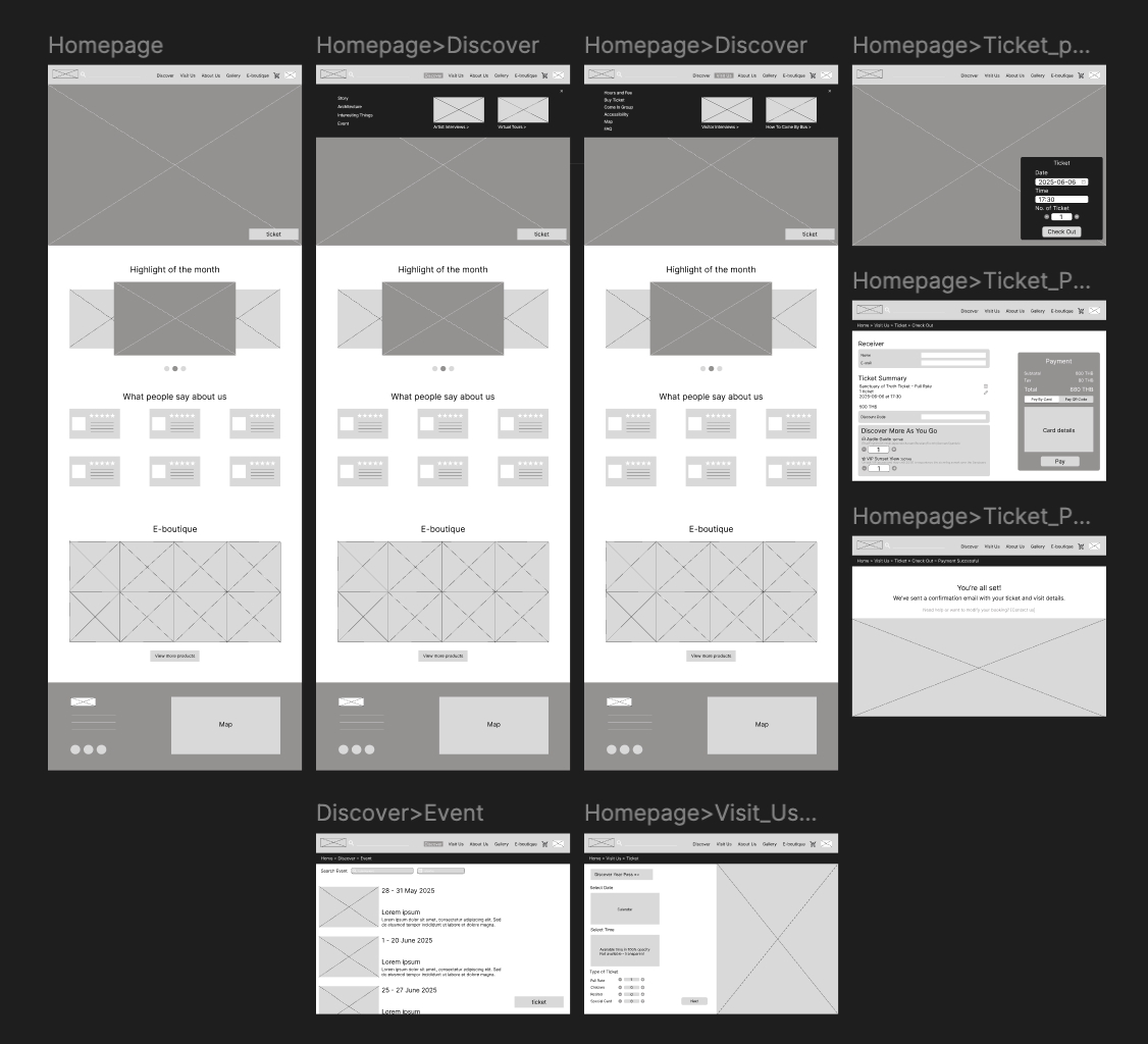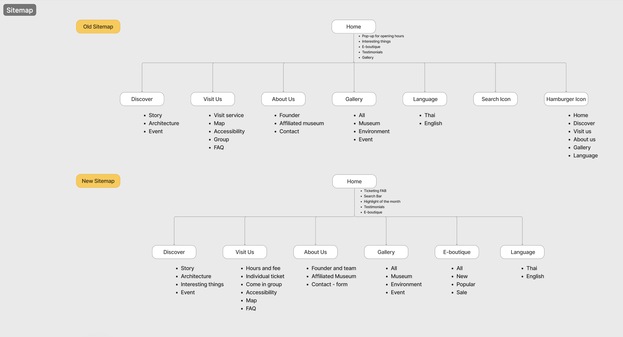 To improve both user navigation and search visibility, I restructured the site’s information architecture with clarity and accessibility in mind. The updated sitemap prioritizes key user action such as discovering highlights, accessing visit information, and purchasing tickets within floating action button (FAB). I grouped culturally rich content under clear categories like “Discover,” while consolidating scattered pages and eliminating dead links. This not only modernizes the browsing experience but also ensures foreign visitors and locals alike can quickly find what they need, enhancing overall engagement and discoverability.